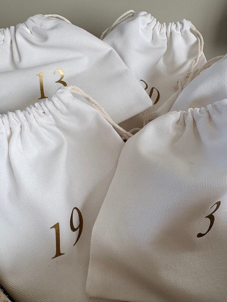 25 pochons en coton, numérotés de 1 à 25 – coloris d’impression « or »