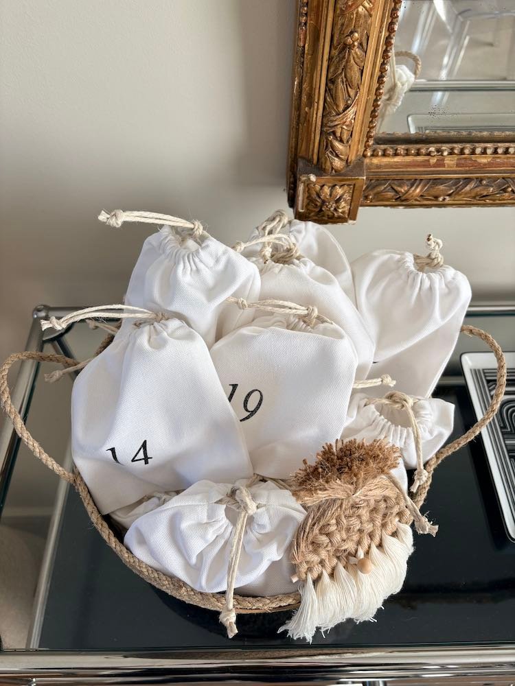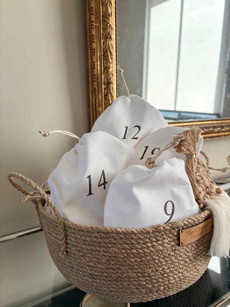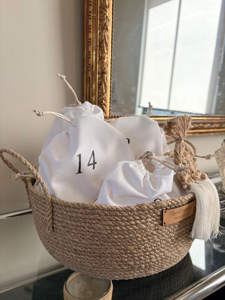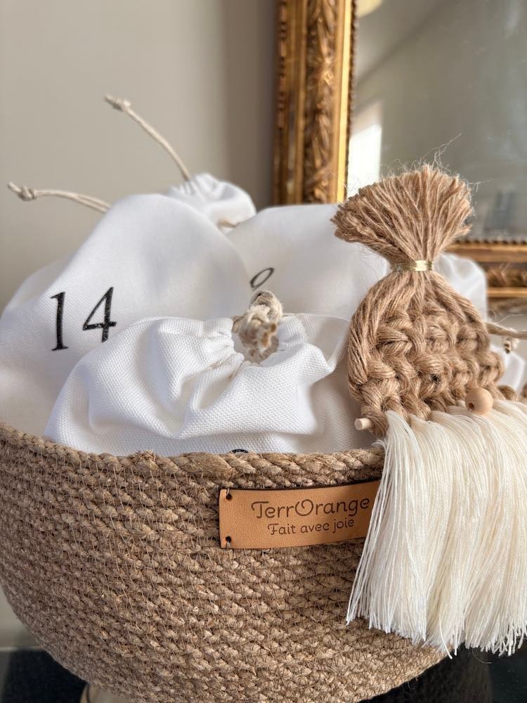 Ce panier en corde naturelle, fait main avec soin, renferme 25 pochons en coton numérotés du 1 au 25 à remplir de petites attentions, surprises ou mots doux.