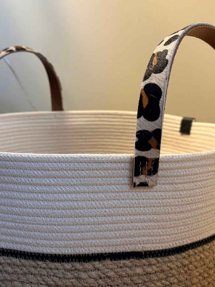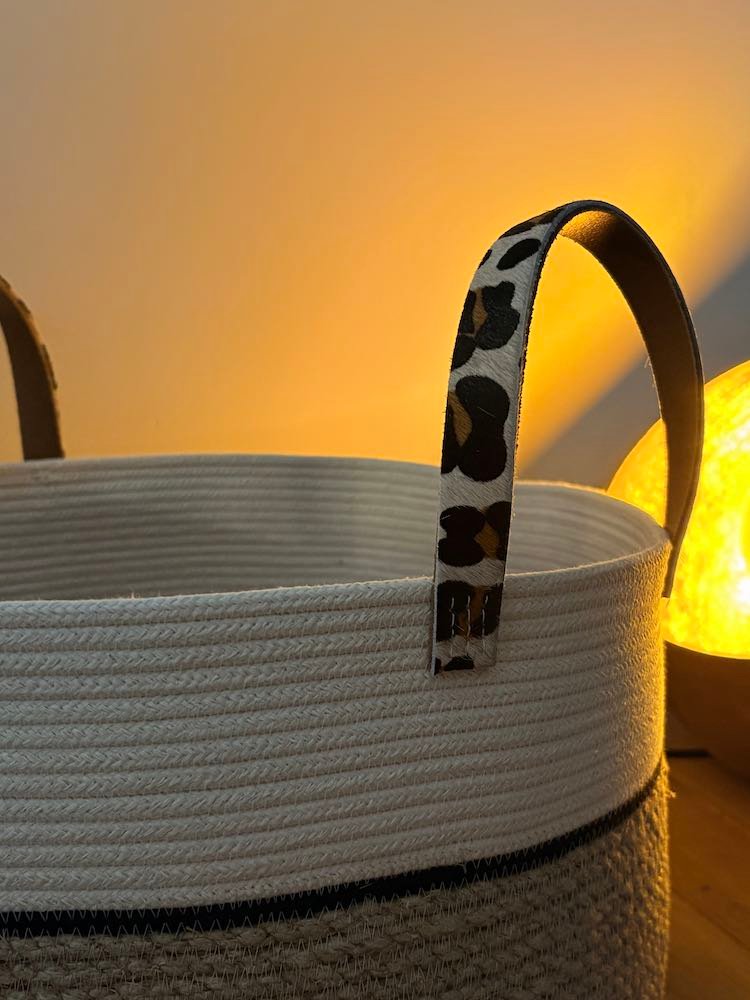 Apportez une touche naturelle et contemporaine à votre décoration d’intérieur avec ce panier décoratif en corde de chanvre naturel et ganses en coton, à anses en cuir « à poils » imprimé léopard.