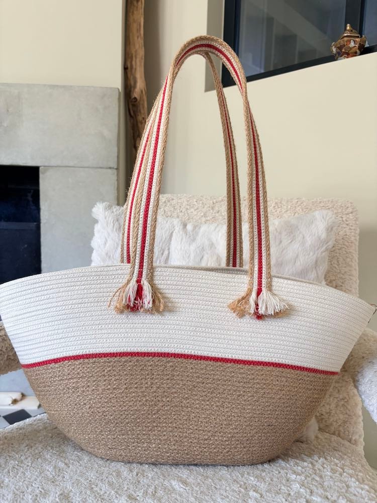 Confectionné en tresse de jute, il est rehaussé d’une ganse de coton écru qui illumine la silhouette, et d’une touche de rouge basque, signature visuelle forte, chaleureuse et intemporelle.