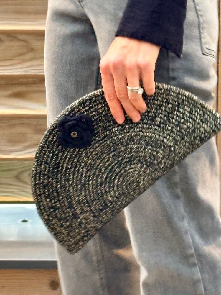 Élégante et raffinée, cette pochette de soirée est l’accessoire idéal pour sublimer vos tenues. Confectionnée à partir de ganse de coton noir et lurex doré, elle joue avec la lumière et apporte une touche chic et moderne à votre style. Son format demi-lune offre une silhouette originale et facile à porter, que ce soit à la main ou glissée sous le bras.