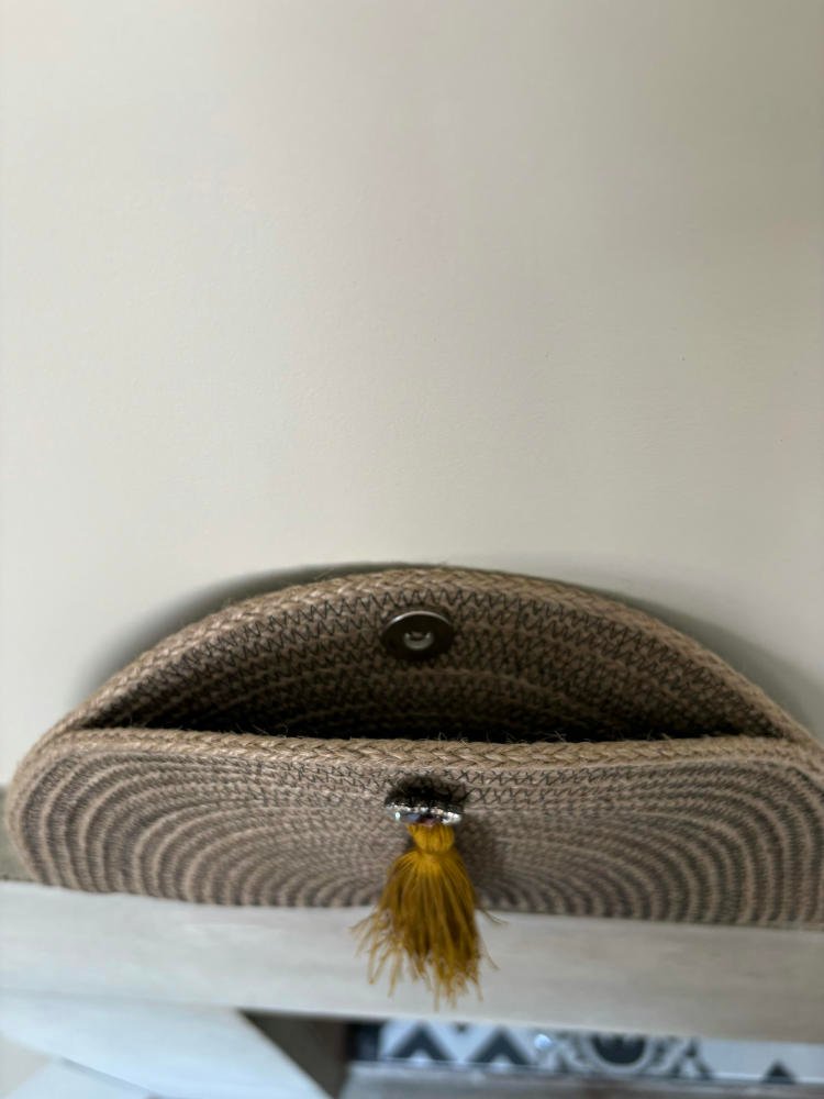 Apportez une touche bohème et chic à votre style avec cette pochette en tresse de jute.